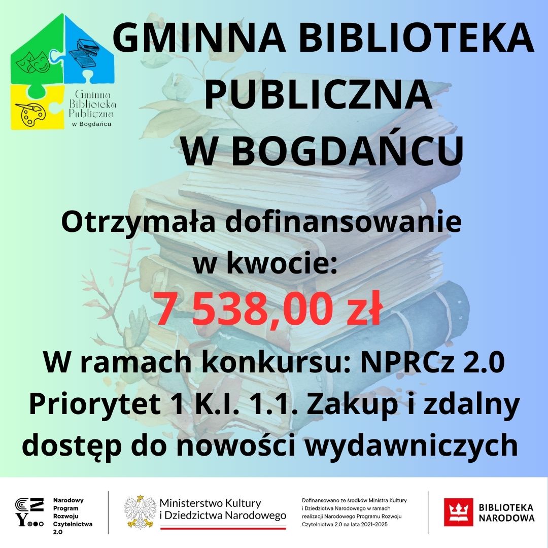 Z przyjemnością informujemy, że Gminna Biblioteka Publiczna w Bogdańcu otrzymała w tegorocznej edycji konkursu dofinansowanie w wysokości 7 538,00 zł na zakup nowości wydawniczych.